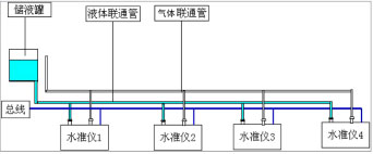 工作原理:各沉降監(jiān)測點安裝壓阻式靜力水準儀,并需要在一相對不動點安裝基準罐。傳感器之間通過高強度的氣壓管聯(lián)接一起匯入到基準罐,每個水準儀內(nèi)部都安裝有高精硅壓傳感器,在基準罐與傳感器之間充滿液體介質,水準儀內(nèi)的壓力傳感器感測到的是該點到基準罐液體表面的壓力,該壓力與液面高度有一定線性關系。如果壓力傳感器感測到壓力發(fā)生變化即說明該點與基準液面之間的高差發(fā)生變化,根據(jù)出廠前的壓力變化量與液面高差的標定線性表,靜力水準儀內(nèi)部的單片機可以計算出高差變化值。根H=P/ρ*g計算出從測點到基準點液面到傳感器高度。原理示意圖如下: